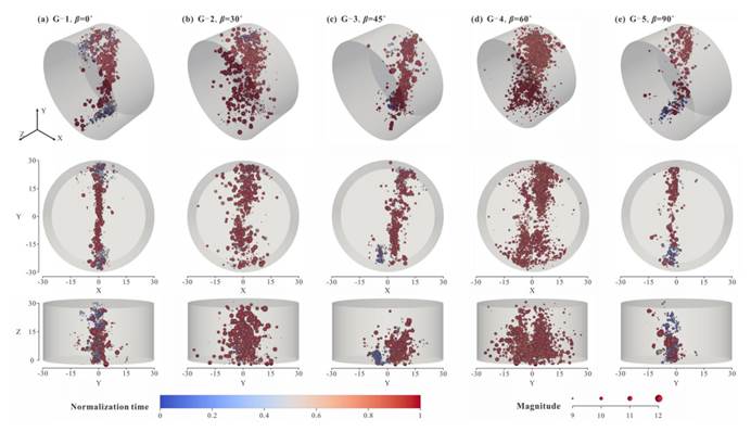 该研究通过片麻岩拉张破坏试验,结合声发射(AE)、数字图像相关方法(DIC)和3D激光扫描技术获得的微破裂定位、应变场及破裂面粗糙度等参数,研究了各向异性角对片麻岩破裂机制的影响。受各向异性角影响,片麻岩试样在拉张应力下表现出三种不同的破坏模式:中心破坏、混合破坏和层活化破坏。宏观裂缝可分为大致平行于加载方向的中心裂缝和大致平行于片麻理面的非中心裂缝。应变数据显示,中心裂缝以拉张为主,而非中心裂缝表现出拉张-剪切混合性质(图1)。微破裂的时空分布和应变的局部化表征了裂缝初始位置和演化路径,中心裂缝从样品中心向两端扩展,非中心断裂则从边缘向内部延伸(图2)。随着各向异性角的增加,破裂面粗糙度降低,这与抗拉强度和累积能量趋势一致,各向异性角对片麻岩力学性能和断裂行为有重要影响。