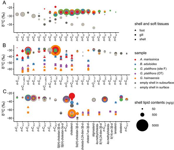 图2双壳类贝壳脂类化合物的含量及其单体碳同位素,以及软组织脂质的δ¹³C值。(A)饱和烃化合物;(B)脂肪酸化合物;(C)正构醇和甾醇类化合物(OT—冲绳海槽)。