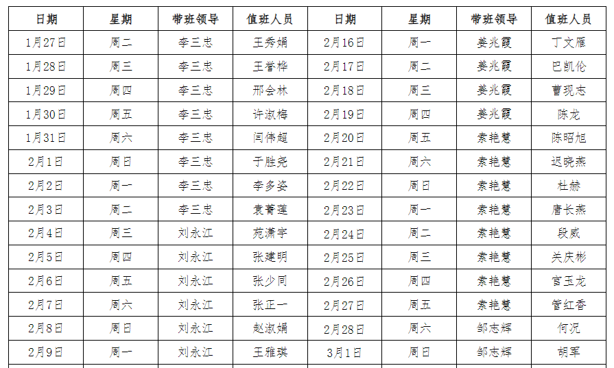 日期星期带班领导值班人员日期星期带班领导值班人员1月21日周二李三忠李四海2月7日周五姜兆霞许淑梅1月22日...